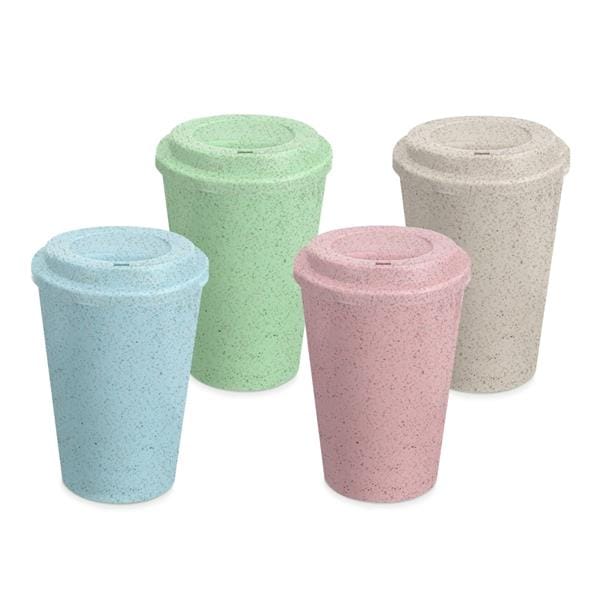 Copo fibra de arroz e polipropileno com capacidade de 450ml livre de BPA, possui tampa com bocal. Altura : 13,6 cm Largura : 9,4 cm Circunferência : 26,1 cm PERSONALIZADA
